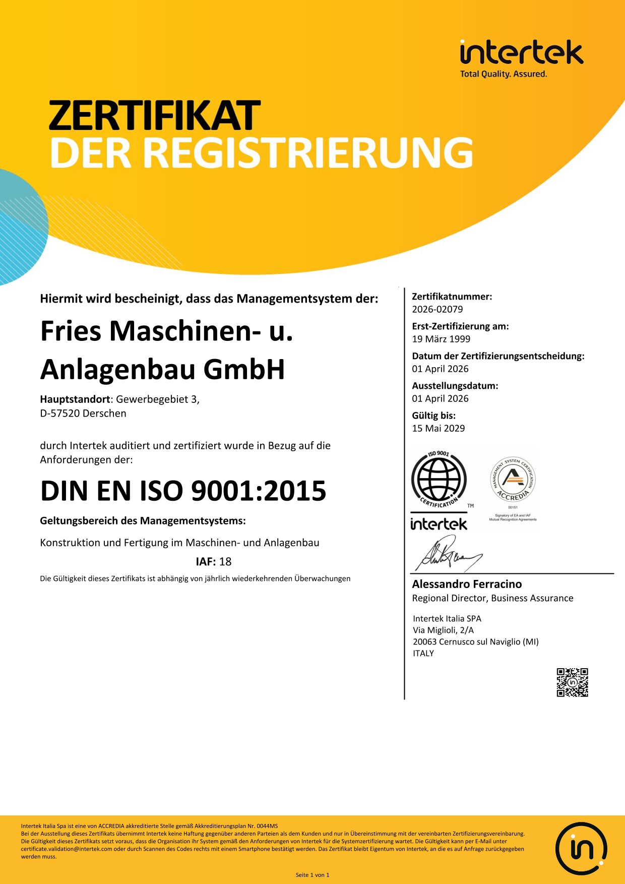 Diese Garantie können wir geben, da wir uns regelmäßig mit den aktuellen Vorschriften rund um das Thema Qualitätsmanagement im Maschinen- und Anlagenbau beschäftigen und in der Prozessoptimierung nicht zum Stillstand kommen. Unser Qualitätsmanagementsystem ist nach ISO 9001 zertifiziert und sorgt durch eine fokussierte und prozessorientierte Vorgehensweise für eine dauerhafte Verbesserung unsere Unternehmensleistung.